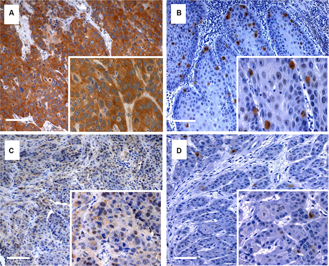 Figure 1: Immunohistochemical staining of Plk3 and pT273 caspase-8. Examples of anal cancer biopsies with high (A, C) and low (B, D) immunohistochemical detection of Plk3 and pT273 caspase-8. Original magnification × 100 (inlets × 400), scale bar: 100 μm.