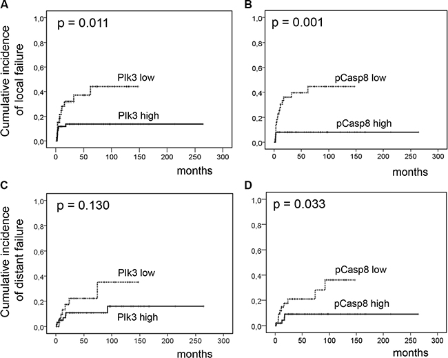 Figure 2: Incidence of locoregional and distant failure according to Plk3 and pT273 caspase-8 expression. Cumulative incidence of locoregional (A–B) and distant failure (C–D) according to low Plk3 expression (individual WS ≤ 6) and pT273 caspase-8 levels (≤ median) vs. high Plk3 expression (WS > 6) and high pT273 caspase-8 levels (> median) in pretreatment biopsies of patients with anal carcinoma treated with definitive CRT.