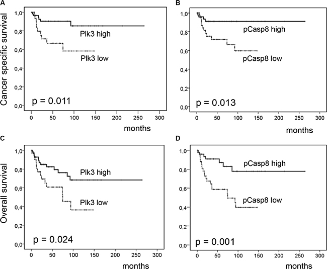 As depicted in Figure 3A and 3B, Plk3 expression (p = 0.011) and pT273 caspase-8 levels (p = 0.013) were significantly related to CSS in univariate analyses. Again, Plk3 expression retained significance (p = 0.016) in multivariate analyses (Table 3). Furthermore, for OS (Figure 3D), we observed a significant correlation to Plk3 and pT273 caspase-8 immunoreactivity (p = 0.024 and p = 0.001) in univariate analyses (Table 3), while N-stage, and Plk3 expression remained independent significant prognostic factors (p = 0.003, and p = 0.023) in multivariate analyses for this parameter (Table 3).