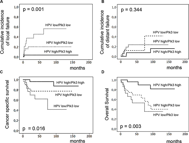 Figure 4: Incidence of locoregional and distant failure, CSS and OS according to combined HPV16 DNA load and Plk3 expression. Cumulative incidence of locoregional. (A) and distant failure (B), CSS (C) and OS (D) according to combined HPV16 DNA load and Plk3 detection (high HPV16 DNA load and high Plk3 vs. high HPV16 DNA load and low Plk3 vs. low HPV16 DNA load and low Plk3 expression) in pretreatment biopsies of patients with anal carcinoma treated with definitive CRT.