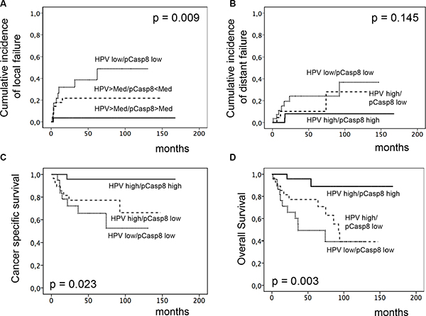 Figure 5: Incidence of locoregional and distant failure, CSS and OS according to combined HPV16 DNA load and pT273 caspase-8 expression. Cumulative incidence of locoregional. (A) and distant failure (B), CSS (C) and OS (D) according to combined HPV16 DNA load and pT273 caspase-8 levels (high HPV16 DNA load and high pT273 caspase-8 vs. high HPV16 DNA load and low pT273 caspase-8 vs. low HPV16 DNA load and low pT273 caspase-8) in pretreatment biopsies of patients with anal carcinoma treated with definitive CRT.
