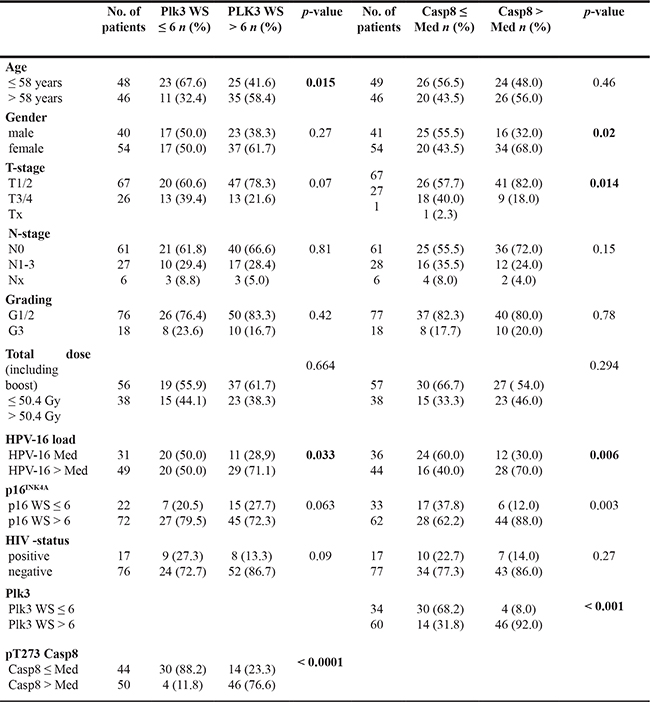 Patient- and tumor-related characteristics according to Plk3 expression and pT273 caspase-8 levels are shown in Table 2. A low Plk3 detection was more prevalent in patients ≤ 58 years (p = 0.015), whereas high Plk3 expression was more common in patients with HPV-16 viral load > median (p = 0.033). By contrast, we observed no significant differences for gender, T- and N-category, tumor grading and total dose including boost. pT273 caspase-8 signals were significantly higher in female patients (p = 0.02), in T1/2 tumors (p = 0.014) and in those with high HPV-16 DNA load (p = 0.006) and p16INK4a expression (p = 0.003). Finally, high Plk3 expression was significantly more prevalent in patients with high levels of pT273 caspase-8 (p < 0.001) and vice versa, indicating a highly close correlation between these molecular markers (Table 2).