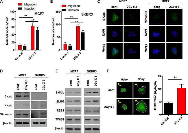 Figure 1: Fractionated radiation promotes invasiveness of breast cancer cells through EMT. (A and B) Migration and invasion assay of MCF7 and SKBR3 breast cancer cells in transwells after fractionated irradiation (2 Gy × 3), respectively. (C) Immunocytochemistry for EMT markers such as E-cadherin and Vimentin in MCF7 cancer cells after irradiation. (D) Protein expression of EMT markers such as E-cadherin, N-cadherin and Vimentin in MCF7 and SKBR3 breast cancer cells after irradiation (E) Protein expression of EMT transcription factors such as SNAIL, SLUG, ZEB1 and TWIST in MCF7 and SKBR3 breast cancer cells after irradiation. (F) Invasion of GFP-transduced MCF7 spheroid cells treated in collagen-based matrix 3D culture system following irradiation. A0 represents the area of sphere at day 0 while At is the area at day 9. β-actin was used as a loading control. Error bars represent mean ± S.D. of triplicate samples. *p < 0.05, and **p < 0.01.