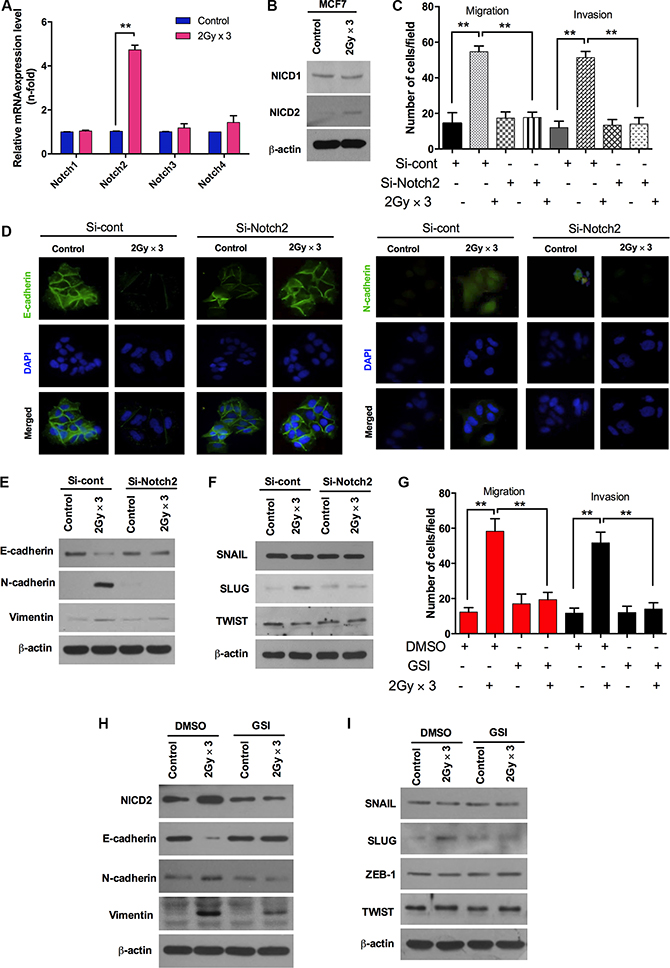 Figure 2: Fractionated radiation-induced Notch signaling promotes EMT in breast cancer cells. (A) qRT PCR analysis for mRNA levels of Notch family members (Notch1-4) in MCF7 breast cancer cell after fractionated irradiation. (B) Protein expression of Notch family such as Notch1 (NICD1) and Notch2 (NICD2) in MCF7 after fractionated irradiation. (C)) Migration and invasion assay in transwells after irradiation of MCF7 that are transfected with siRNA targeting Notch2. (D) Immunocytochemistry for EMT markers (E-cadherin and N-cadherin) after fractionated irradiation of MCF7 that are treated with siRNA targeting Notch2. (E) Western blot for EMT markers such as E-cadherin, N-cadherin and Vimentin in MCF7 cells that are transfected with siRNA targeting Notch2 prior to irradiation. (F) Western blots for EMT transcription factors such as SNAIL, SLUG and TWIST in MCF7 cells that are transfected with siRNA targeting Notch2 and irradiated afterwards. (G) Migration and invasion assay in transwells after irradiation of MCF7 that are treated with gamma-secretase inhibitor, well known Notch signaling inhibitor (GSI, 20 μM). (H and I) Western blot for EMT markers and regulators after fractionated irradiation in MCF7 cells that are treated with pretreated with GSI. β-actin was used as a loading control. Error bars represent mean ± S.D. of triplicate samples. *p < 0.05, and **p < 0.01.