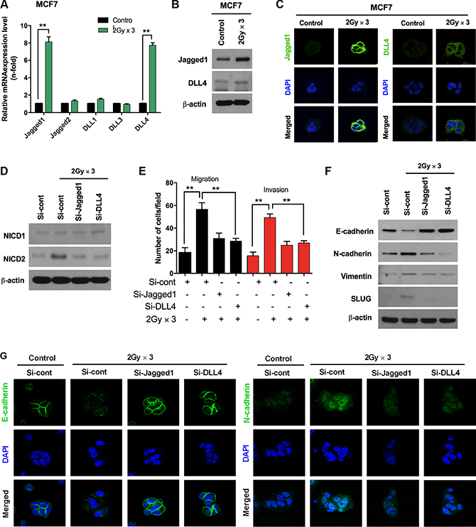As the Jagged-1 mediated activation of Notch signaling is important during the induction of EMT [27], we subsequently sought to determine whether Notch ligands are expressed in breast cancer cells due to fractionated radiation. Since the Notch2 receptor is recognized in irradiated breast cancer cells and the intracellular signaling is transduced by Notch ligands. By analyzing multiple Notch ligands, we found that Jagged1 and DLL4 mRNA were increased significantly in irradiated MCF7 cells as compared to un-irradiated cells, whereas the smaller changes noted in Jagged2, and DLL1 transcripts did not reach statistical significance (Figure 3A). Additionally, elevated Jagged1 and DLL4 mRNA levels resulted in increased accumulation of protein levels in irradiated MCF7 cells as compared with un-irradiated cells (Figure 3B). Immunocytochemistry also exposed higher expression levels of Jagged1 and DLL4 in MCF7 cells after fractionated radiation (Figure 3C). Due to the strong accumulation of Jagged1 and DLL4 in response to radiation, we decided to analyze the effects of Jagged1 and DLL4 inhibition in irradiated MCF7. Here we observed that NICD2 was significantly down-regulated after the knock-down of these ligands; however, NICD1 remained unchanged in irradiated MCF7 cells (Figure 3D). Interestingly, the knock-down of Jagged1 and DLL4 also blocked Notch-induced invasion and migration along with increased E-cadherin and decreased N-cadherin and vimentin protein levels in irradiated MCF7 cancer cells (Figure 3E and 3F). Restoration of pericellular E-cadherin together with attenuation of N-cadherin indicates that the expressions of Jagged1 and DLL4 are crucial for radiation activated Notch signaling for the induction of EMT (Figure 3G).