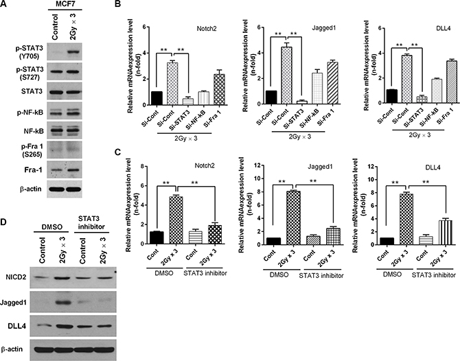 Figure 4: Fractionated radiation up-regulates Notch signaling through activation of STAT3. (A) Western blot analysis for STAT3, NF-κB and Fra-1 phosphorylation status rafter irradiation of MCF7 breast cancer cells. (B) qRT-PCR for Notch2, Jagged-1 and DLL4 mRNA levels after irradiation of MCF7 cells that are transfected with siRNA targeting STAT3, NF-κB and Fra-1. (C) qRT-PCR for Notch2, Jagged1 and DLL4 mRNA levels after irradiation of MCF7 cells that are treated with STAT3 inhibitor (2 μM). (D) Western blot for NICD2, Jagged1 and DLL4 after fractionated irradiation (2 Gy × 3) of MCF7 that are treated with STAT3 inhibitor (2 μM). Error bars represent mean ± S.D. of triplicate samples. *p < 0.05, **p < 0.01 and ***p < 0.001.