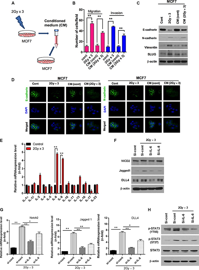 Figure 5: Radiation-induced IL6 secretion mediates activation of Notch signaling. (A) Schematic model illustrating conditioned medium treated MCF7 breast cancer cells. MCF7 cells were irradiated 2 Gy × 3 as mentioned earlier. Then cell’s medium was further harvested and treated to another MCF7 cells. (B) Migration and invasion assay in transwells after irradiated cultured medium those are compared with directly irradiated MCF7 cells. (C) Western blot and (D) immunocytochemistry for EMT markers after fractionated irradiation of MCF7 that are treated with irradiated cultured medium. (E) qRT PCR analysis for mRNA levels of cytokines family in MCF7 cells after fractionated irradiation. (F) Western blot for NICD2, Jagged1 and DLL4 after fractionated irradiation of MCF7 that are transfected with siRNA targeting IL-6 and IL-8. (G) qRT-PCR for Notch2, Jagged-1 and DLL4 mRNA levels after irradiation of MCF7 cells that are transfected with siRNA targeting IL-6 and IL-8. (H) Western blot for activation of STAT3 after fractionated irradiation of MCF7 that are transfected with siRNA targeting IL-6 and IL-8. β-actin was used as a loading control. Error bars represent mean ± S.D. of triplicate samples. *p < 0.05 and **p < 0.01.