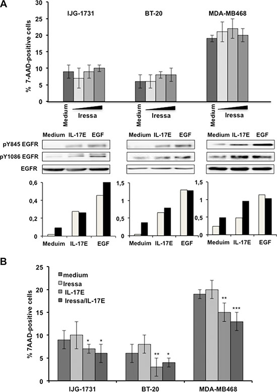 Figure 1: IL-17E phosphorylates the EGFR in Iressa-resistant TNBC cell lines. (A) In the upper panel, IJG-1731, BT20, and MDA-MB468 TNBC cells were cultured alone or in the presence of increasing concentrations of the EGFR inhibitor Iressa (0.25 (■), 0.5 (■), and 1 (■) μM) for 48 hours, and cell death was evaluated by determining the percentage of 7AAD-positive cells and by flow cytometry analysis. The results are presented as the mean ± SD of three independent experiments performed in triplicate. In the middle panel, TNBC cells were cultured alone or in the presence of IL-17E (10 ng/ml) or EGF (10 ng/ml), and the phosphorylation of EGFR at residues Y845 and Y1086 was assessed by western blotting. Membranes were re-blotted with anti-EGF as a loading control. Data are representative of 3 independent experiments. In the lower panel, densitometric quantification of EGFR phosphorylation, as shown in the representative blots, is expressed as the ratios of pY845 EGFR to EGFR (■) and pY1086 EGFR to EGFR (■). (B) IJG-1731, BT20, and MDA-MB468 TNBC cells were cultured alone or in the presence of Iressa (1 μM), IL-17E (10 ng/ml), or a combination of both for 48 hours, and the percentage of 7AAD-positive cells was determined by flow cytometry. The results are presented as the mean ± SD of three independent experiments performed in triplicate. Student t-test was used (*P < 0.05; **P < 0.01; ***P < 0.001) compared with medium alone.