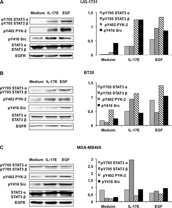 Figure 2: IL-17E phosphorylates the kinases essential for EGFR activation. IJG-1731 (A), BT20 (B), and MDA-MB468 (C) cells were cultured alone or in the presence of IL-17E (10 ng/ml) or EGF (10 ng/ml), and then STAT3 phosphorylation at Y705, PYK-2 phosphorylation at Y402 and Src phosphorylation at Y416 were assessed by western blotting (left panel). Membranes were re-blotted with anti-EGF or anti-STAT3α/β antibodies, which served as loading controls. Data are representative of 3 independent experiments. In the right panel, densitometric quantification of STAT3a/b, PYK-2 and Src phosphorylation, as shown in the representative blots, is expressed as the ratios of pY705 STAT3a and b to their respective un-phosphorylated forms, pY402 PYK-2, pY416 Src and EGFR, as indicated.