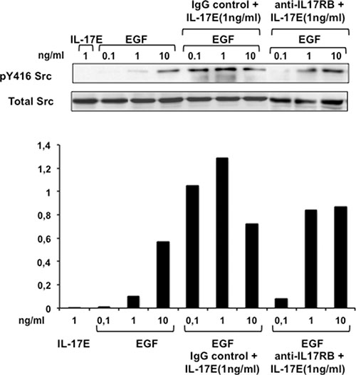 Figure 4: IL-17E synergizes with EGF in phosphorylating Src kinase. MDA-MB468 cells were left untreated or treated with anti-IL-17RB mAb (10 μg/ml) or its isotype IgG control and then stimulated with IL-17E (1 ng/ml), EGF (0.1–10 ng/ml), or a combination of IL-17E (1 ng/ml) and various concentrations of EGF (0.1–10 ng/ml). Src phosphorylation (p416Src) was then assessed by western blotting using specific anti-pSrc antibodies. Re-blotting with anti-Src antibody was performed to determine equal loading. Data are representative of 2 independent experiments. In the lower panel, densitometric quantification of Y416 Src, as shown in the representative blots, is expressed as the ratio of pY416 Src to total Src.