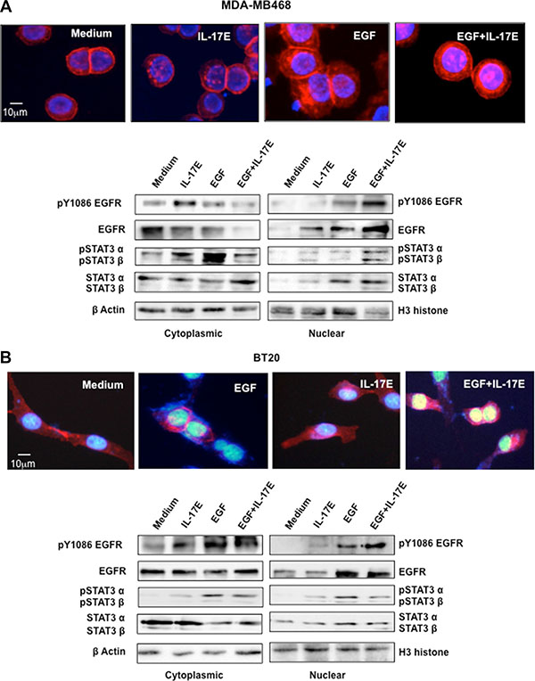 Figure 5: IL-17E facilitates pEGFR and pSTAT3 co-translocation to the nucleus. MDA-MB468 (A) or BT20 (B) cells were stimulated with IL-17E (10 ng/ml), EGF (10 ng/ml) or a combination of both. In the upper panel of (A) and (B), EGFR localization, as assessed by immunostaining with anti-EGFR antibodies (red). Nuclei were visualized with DAPI (blue). In the lower panel of (A) and (B), translocation of EGFR, STAT3α/β, and their phosphorylated counterparts from the cytoplasm to the nucleus, as assessed by western blotting using specific antibodies. Anti-β actin and H3 histone antibodies were used as loading controls for the cytoplasmic and nuclear fractions, respectively. Data are representative of 2 independent experiments. Densitometric quantifications are presented in Supplementary Figure 1 (MDA-MB468) and Supplementary Figure 2 (BT20).