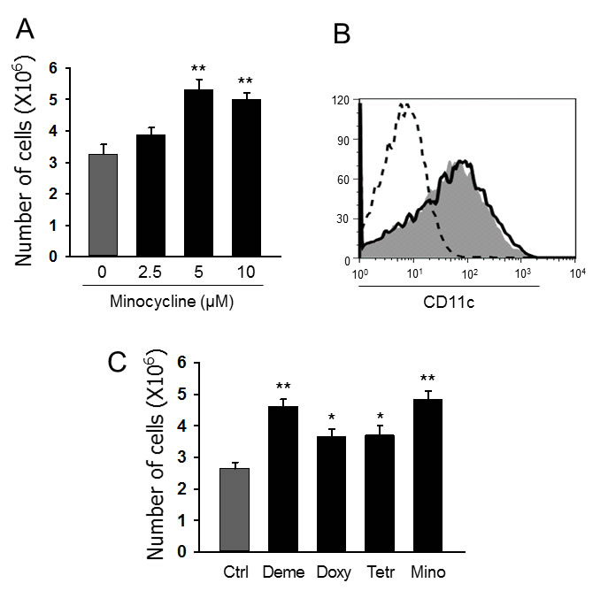 Figure 1: Minocycline enhances the generation of DCs from BM cells. A. DCs were generated from C57BL/6 mouse BM cells using GM-CSF (40 ng/ml) and IL-4 (40 ng/mL) without (Ctrl-DCs) or with indicated concentrations of minocycline (Mino-DCs) for 7 days. The data are presented as the mean ± SD of six independent experiments; **P < 0.01. B. Representative histograms showing CD11c expression in DCs generated with 5 μM minocycline. Solid line, Ctrl-DCs; shaded area, Mino-DCs; dotted line, isotype-matched control. C. DCs were generated from C57BL/6 mouse BM cells using GM-CSF and IL-4 with indicated concentrations of tetracycline antibiotics for 7 days (Deme: demeclocycline; Doxy: doxycycline; Tetr: tetracycline; Mino: minocycline). The data are presented as the mean ± SD of six independent experiments; * P < 0.05, **P < 0.01 compared with control.
