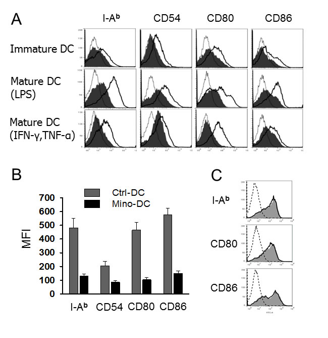 Figure 2: DCs generated in the presence of minocycline resist maturation. A. Immature DCs generated from C57BL/6 mouse BM cells with (Mino-DCs) or without (Ctrl-DCs) minocycline were exposed to 100 ng/ml LPS or 50 ng/mL IFN-γ plus 50 ng/mL TNF-α for 24 h to induce maturation and analyzed by flow cytometry for the expression of I-Ab, CD54, CD80 and CD86. Mino-DCs, shaded area; Ctrl-DCs, black line; isotype-matched control, grey line. B. Mean fluorescence intensities of LPS-stimulated DCs. The data are presented as the mean ± SD of three independent experiments. C. Immature Ctrl-DCs were stimulated with 50 ng/mL IFN-γ and 50 ng/mL TNF-α in the presence (shaded area) or absence (solid lines) of minocycline for 24 h and analyzed by flow cytometry; dotted line, isotype-matched control.