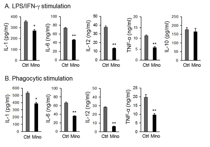 Figure 3: DCs generated in the presence of minocycline are deficient in cytokine secretion. Immature DCs generated from C57BL/6 mouse BM cells with (Mino-DCs) or without (Ctrl-DCs) minocycline were stimulated with 100 ng/ml LPS (A) or biodegradable OVA-microspheres (50 μg/ml as OVA) (B) for 24 h. For induction of IL-10 production, DCs were stimulated with 100 ng/ml LPS and 50 ng/mL IFN-γ. Cytokine secretion to culture supernatant was determined by ELISA. The data are presented as the mean ± SD of three separate experiments; * P < 0.05, **P < 0.01 compared with control.