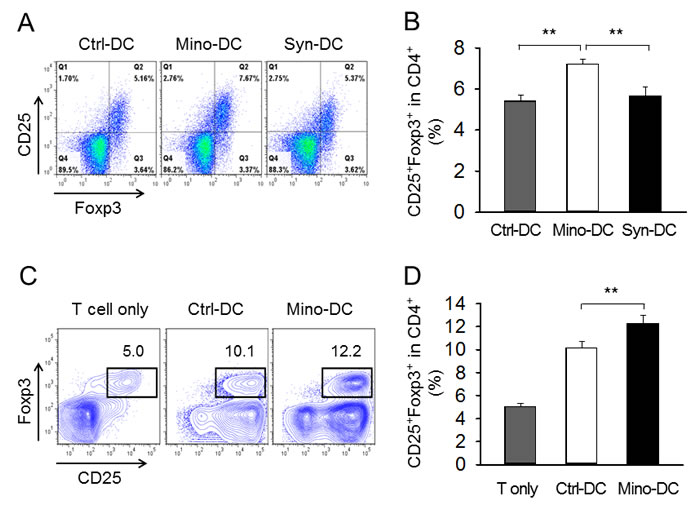 Figure 6: DCs generated in the presence of minocycline induce Foxp3+ Treg cells. A. Immature DCs generated from C57BL/6 mouse BM cells with (Mino-DCs) or without (Ctrl-DCs) minocycline were stimulated with LPS for 24 h to mature, and then transferred to BALB/c mice (1 × 106/mouse). DCs generated from BM cells of BALB/c mice served as a syngeneic DC control. After 7 days, spleen cells were isolated and subjected to flow cytometry. Cells were gated on CD4+ cells, and analyzed for the expression of CD25 and Foxp3. B. The proportion of CD25+Foxp3+ T cells in the CD4+ cell population of each experimental group. **P < 0.01. C. Immature DCs generated from C57BL/6 mouse BM cells with (Mino-DCs) or without (Ctrl-DCs) minocycline were stimulated to maturity with IFN-γ plus TNF-α for 24 h, pulsed with the OVA323-339 peptide (10 μg/ml), washed, and co-cultured with CD4+ T cells isolated from OT-II mice in the presence of 100 U/ml IL-2. After 4 days, cells were harvested and stained as described in (A). Cell populations were gated on CD4+ cells, and then analyzed for the expression of CD25 and Foxp3. D. The proportion of CD25+Foxp3+ T cells in the CD4+ cell population of each experimental group. **P < 0.01.