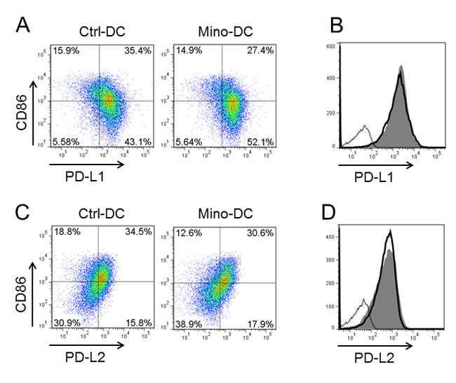 To investigate the mechanism underlying the ability of Mino-DCs to increase the generation of Treg cells, we examined the expression levels of surface PDL-1 and PDL-2 in Mino-DCs. The proportion of PDL-1hiCD86low cells was significantly higher in Mino-DCs compared to that in Ctrl-DCs (52.1% vs. 43.1%, Figure 7A). In contrast, the proportion of PDL-1hiCD86hi cells was much lower in Mino-DCs compared to that in Ctrl-DCs (27.4% vs. 35.4%, Figure 7A). Interestingly, no discernible differences could be observed in the overlay histogram (Figure 7B). Unlike PDL-1, there was no significant difference in the proportion of PDL-2hiCD86low cells between Mino-DCs and Ctrl-DCs (Figure 7C, 7D). These results confirm the regulatory properties of Mino-DCs.