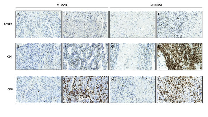 Figure 1: Representative immunohistochemical staining of FOXP3, CD4 and CD8 in tumor and stroma compartments. Original magnification X200. A. Low infiltration of FOXP3+ lymphocytes in tumor compartment, B. high infiltration of FOXP3+ lymphocytes in tumor compartment, C. low infiltration of FOXP3+ lymphocytes in stroma compartment, D. high infiltration of FOXP3+ lymphocytes in stroma compartment, E. low infiltration of CD4+ lymphocytes in tumor compartment, F. high infiltration of CD4+ lymphocytes in tumor compartment, G. low infiltration of CD4+ lymphocytes in stroma compartment and, H. high infiltration of CD4+ lymphocytes in stroma compartment, I. Low infiltration of CD8+ lymphocytes in tumor compartment, J. high infiltration of CD8+ lymphocytes in tumor compartment, K. low infiltration of CD8+ lymphocytes in stroma compartment, L. high infiltration of CD8+ lymphocytes in stroma compartment.
