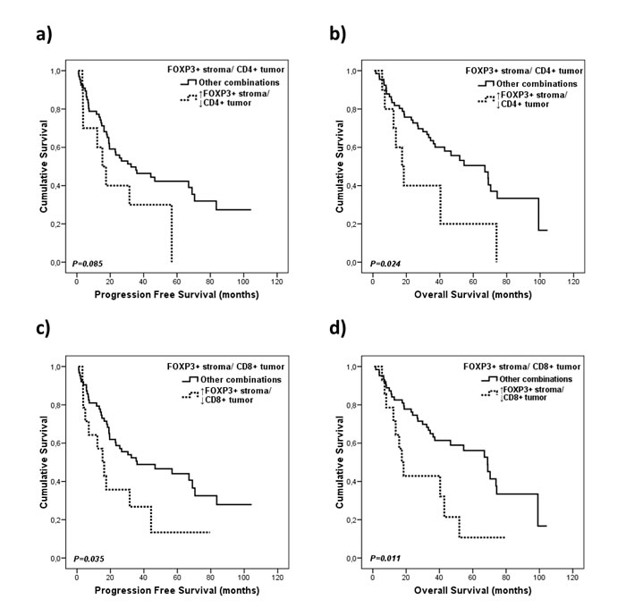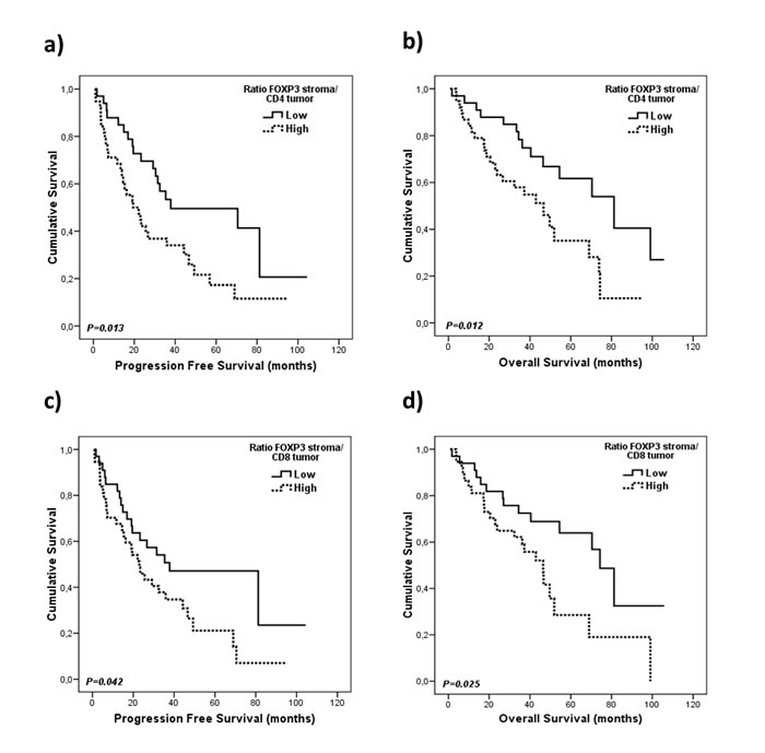 Survival analyses indicated that patients with high CD4 expression in the tumor compartment, dichotomized according to the median of its relative expression, had improved PFS (37.8 vs. 23 months, p = 0.042) and OS (81.2 vs. 42.9 months, p = 0.018). Similarly, high levels of CD8 expression in the tumor compartment were associated with improved PFS (81.2 vs. 19.4 months, p = 0.001) and OS (81.2 vs. 37.2 months, p < 0.001). The expression of CD8 in the stroma was also correlated with OS (74.3 vs. 46.4 months, p = 0.032). With respect to FOXP3 high expression levels were correlated with longer PFS (35.3 vs. 22.1 months, p = 0.020) and OS (NR vs. 37.2 months, p = 0.005).. Moreover, patients with high expression levels of LAG3 presented a better OS (69 vs. 36.2 months, p = 0.023), and the same was observed for TGFB1 (74.3 vs. 46.6 months, p = 0.032; Table 2). Kaplan-Meier plots for all these biomarkers are shown in supplementary Figure 1.