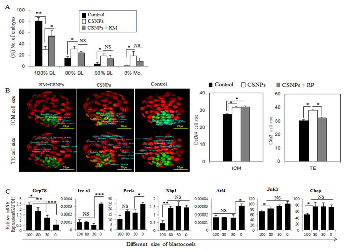 Figure 3: The rescue effect of rapamycin on CSNPs-induced ER stress. A. After treatment with CSNPs, morula-stage embryos exhibited developmental delay. Blastocoel size was divided into four groups (0% to 100%) based on the effect caused by CSNPs. B. Immunostaining of OCT3/4 for the ICM marker and CDX2 for the trophoblast cell marker were performed, and then size was measured. The graph shows each cell size. The ICM cell size was larger when the ICM was treated with CSNPs and rapamycin compared to that of the control. In the TE, the cell size was recovered by rapamycin treatment. RP indicates rapamycin. C. The expression levels of various genes involved in ER stress, such as Grp78, Ire1a, Perk, Xbp1, Atf4, Jnk1, and Chop, were determined in each group of blastocysts. *, **, ***, and NS indicate p<0.05, p<0.01, p<0.001, and not significant, respectively..