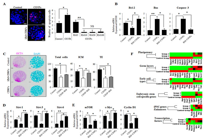 Figure 5: The effects of rapamycin on CSNPs-induced embryonic defects. A. The determination of apoptosis in preimplantation embryos after CSNPs treatment. The numbers of apoptotic cells were measured using TUNEL-positive cells. Apoptotic cells were observed very rarely in the control group. The CSNPs-treated groups showed increased numbers of TUNEL-positive cells. After pre-treatment with rapamycin, apoptosis decreased. Various concentrations of rapamycin (5~100 µg/ml) resulted in the suppression of apoptotic cells. B. Real time qRT-PCR analysis was used to measure Bcl-2, Bax, and Caspase-3 mRNA expression. C. Immunostaining analysis of ICM and TE cells using CDX2 and OCT3/4. The total cell numbers were measured in the ICM and the TE. The CSNPs-treated group showed a lower number of ICM and a lower total cell number. Rapamycin rescued the effect of CSNPs. D. Real time qRT-PCR analysis of the Sirtuin family pathway. E. Real time qRT-PCR analysis of the mTOR pathway. F. The graphs of the validation of self-renewal, ICM, TE, and three germ cell layer markers. The heat map represents the changes in gene expression in the control, CSNPs-treated and rapamycin-pretreated embryos. The 6 groups are clustered around the horizontal axis with gene names on the vertical axis. *, **, and NS indicate p < 0.05, p < 0.01, and not significant, respectively. RM indicates rapamycin.