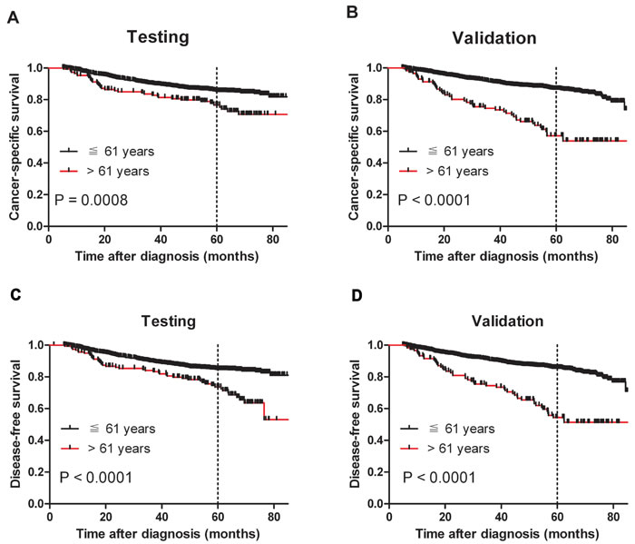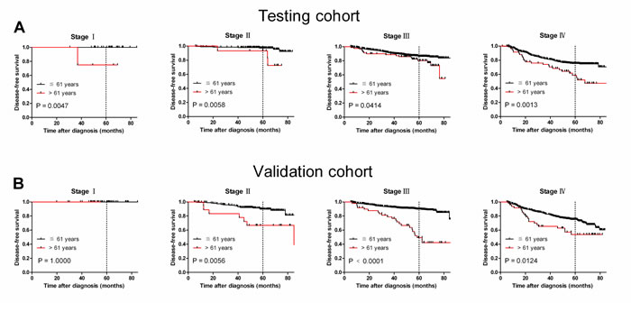 Figure 4: Older age was associated with shorter NPC disease-free survival in subsets of different cancer stages (log-rank test). A. Stage I, probability of survival of stage I patients with NPC in the testing cohort; ≦ 61 years, n = 33; > 61 years, n = 4. Stage II, probability of survival of stage II patients with NPC in the testing cohort; ≦ 61 years, n = 211; > 61 years, n = 15. Stage III, probability of survival of stage III patients with NPC in the testing cohort; ≦ 61 years, n = 697; > 61 years, n = 82. Stage IV, probability of survival of stage IV patients with NPC in the testing cohort; ≦ 61 years, n = 473; > 61 years, n = 62. B. Stage I, probability of survival of stage I patients with NPC in the validation cohort; ≦ 61 years, n = 42; > 61 years, n = 2. Stage II, probability of survival of stage II patients with NPC in the validation cohort; ≦ 61 years, n = 206; > 61 years, n = 19. Stage III, probability of survival of stage III patients with NPC in the validation cohort; ≦ 61 years, n = 758; > 61 years, n = 49. Stage IV, probability of survival of stage IV patients with NPC in the validation cohort; ≦ 61 years, n = 451; > 61 years, n = 49.