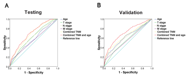 Figure 6: ROC curve analysis for different clinicopathological features was performed to evaluate the survival status. A. Age (AUC = 0.573; P < 0.001), T stage (AUC = 0.613; P < 0.001), N stage (AUC = 0.595; P < 0.001), M stage (AUC = 0.552; P = 0.008), combined TNM (AUC = 0.678; P < 0.001), and combined TNM and age (AUC = 0.696; P < 0.001) indicated significant associations with survival status in the testing cohort. B. Age (AUC = 0.623; P < 0.001), T stage (AUC = 0.564; P = 0.001), N stage (AUC = 0.616; P < 0.001), M stage (AUC = 0.560; P = 0.002), combined TNM (AUC = 0.650; P < 0.001), and combined TNM and age (AUC = 0.709; P < 0.001) were used to test the survival status in the validation cohort.
