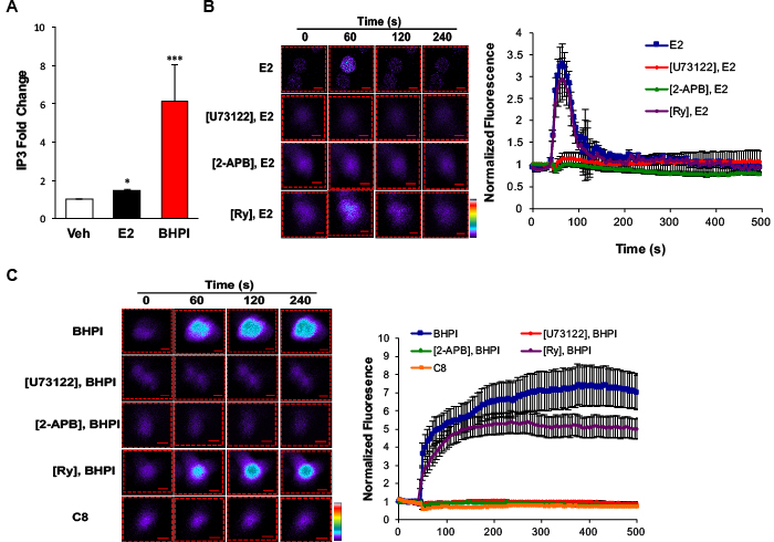 Figure 1: BHPI and estrogen stimulate release of calcium from the endoplasmic reticulum into the cytosol. A. Quantitation of intracellular IP3 levels after 10 min treatment with DMSO, 17β-estradiol (E2), or BHPI in PEO-4 ovarian cells (n = 3). B., C. Estrogen and BHPI increase cytosol calcium levels. Visualization of cytosolic Ca2+ using Fluo-4 AM; estrogen or BHPI was added to PEO-4 cells at 50 s. Color scale from basal Ca2+ to highest Ca2+: purple, blue, green, yellow, red, white. Quantitation of cytosolic Ca2+ levels after pre-treating PEO-4 cells with U73122, 2-APB, or Ry followed by treatment with estrogen or BHPI (n = 12-20). Concentrations: U73122, 1 μM; 2-APB, 100 μM; Ry, C8, 10 μM; E2, 200 nM; BHPI, 10 μM. *P < 0.05, ***P < 0.001.