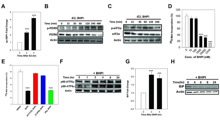 Efflux of calcium stored in the lumen of the EnR into the cell body activates the UPR. The core UPR signaling cascade consists of 3 EnR sensors whose activation increases protein-folding capacity and temporarily reduces protein production (Supplementary Figure 1). Activation of IRE1α, which alternatively splices the transcription factor XBP1, produces the widely used UPR marker, active spliced XBP1 (sp-XBP1) [33]. Supporting activation of the IRE1α branch of the UPR, in PEO-4 ovarian cancer cells, BHPI and E2 robustly induced sp-XBP1 (Figure 2A and Supplementary Figure 2A). Protein synthesis is regulated by autophosphorylation of PERK [34]. Phosphorylated PERK (p-PERK) phosphorylates of eukaryotic initiation factor 2 α (eIF2α), which leads to transient inhibition of protein synthesis (Supplementary Figure 1). E2 induced a weak and transient phosphorylation of eIF2α in ovarian cells (Supplementary Figure 2B), while BHPI elicited robust phosphorylation of PERK and eIF2α (Figure 2B, 2C), resulting in inhibition of most protein synthesis (Figure 2D) and a decline in total PERK and eIF2α protein (Figure 2B, 2C). Consistent with their inhibitors’ ability to block calcium efflux (Figure 1B, 1C), inhibition of PLCγ with U73122 and locking the IP3R calcium channels with 2-APB, but not inhibition of the RyR calcium channels, reversed BHPI inhibition of protein synthesis (Figure 2E). EnR stress leads to proteolytic cleavage of ATF6α to active 50 kDa ATF6α (p50-ATF6α) (Supplementary Figure 1) [35]. Demonstrating BHPI and E2 activate the ATF6α arm of UPR, E2 and BHPI increased p50-ATF6α levels in PEO-4 cells (Figure 2F and Supplementary Figure 2C). Active p50-ATF6α increases production of BiP/GRP78/HSPA5 and other EnR chaperones [35]. BHPI and E2 increased production of BiP mRNA in PEO-4 ovarian cancer cells (Figure 2G and Supplementary Figure 2D). However, since BHPI inhibited protein synthesis (Figure 2D and 2E), BiP protein levels were reduced in BHPI-treated PEO-4 cells (Figure 2H).