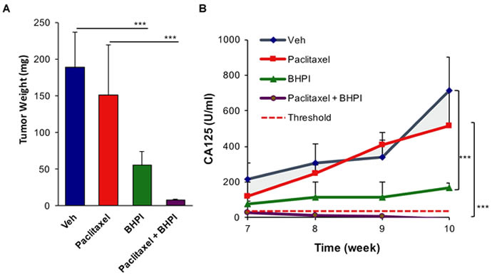 Figure 6: BHPI plus paclitaxel eliminates orthotopic multidrug resistant OVCAR-3 tumors. A. Average tumor weight from each treatment group (n = 5). For the paclitaxel group the secondary growths were included in tumor weight. B. Circulating serum CA125 biomarker quantitation showing the progression of tumors in each treatment group (n = 5). Threshold in humans (dashed line) denotes 35 U/ml of circulating CA125. Data is the mean ± SEM. ***P < 0.001.