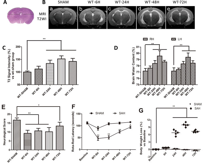 The RR latency and Modified Garcia Score (MGS) decreased dramatically at 6h after SAH relative to their sham-operated counterparts. At later times, the rotorod (RR) latency and MGS performance gradually improved but continuously remained below the sham group levels. Meanwhile, compared with sham-operated mice, body weight loss progressively increased and peaked at 48h after SAH (Figure 2E-2G). (**p < 0.01,*p < 0.05 respectively, n = 5)