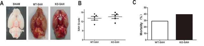 Figure 1: SAH grade and overall mortality. Data are expressed as mean ± SEM. A.-B., SAH grade in WT group and Apoe KO group were not significantly different. C. The overall mortality rate within 72h after SAH was 28.57% (34 of 119) in the WT group and 39.02% (16 of 41) in the KO group, with nonstatistical difference.