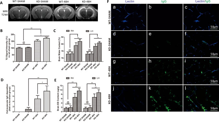 Figure 5: Apoe deficiency aggravates vasogenic brain edema and BBB permeability. Data are expressed as mean ± SEM. A.-C. The Vasogenic cerebral edema and brain water content were not significantly deferent from each other in the sham groups (WT-SHAM vs KO-SHAM, @ represents that p > 0.05, n = 5). However, after SAH, T2-weight image (T2WI) MRI detected vasogenic cerebral edema in the prior dotted area and brain water content were dramatically deferent from each other with a higher edema level in the Apoe-deficient mice. The BBB permeability was not significantly different in the sham group detected by Evans blue (EB) extravasation D. and plasma immunoglobulin G immunofluorence staining E.-F.. However, both the brain EB content and extravascular IgG deposition were significantly elevated with higher levels far from the wild-type mice in Apoe-deficient mice (*P < 0.05, **P < 0.01, n = 5 respectively, RH = right hemisphere, LH = left hemisphere, Blue lectin positive area indicate microvessels; green area indicate perivascular deposition of IgG; n = 5 each group).