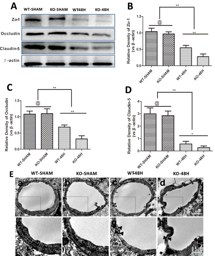 The three main TJs were not significantly different between the sham groups (WT-SHAM vs KO-SHAM, @ represents p > 0.05, n = 5). However, TJs were dramatically reduced 48 h after SAH and further affected by Apoe deficiency (WT-48H vs KO-48H, **p < 0.01,*p < 0.05, n = 5). Similarly, TEM observation showed more disruptions in TJs and vacuolations between endothelial cells (Figure 6).