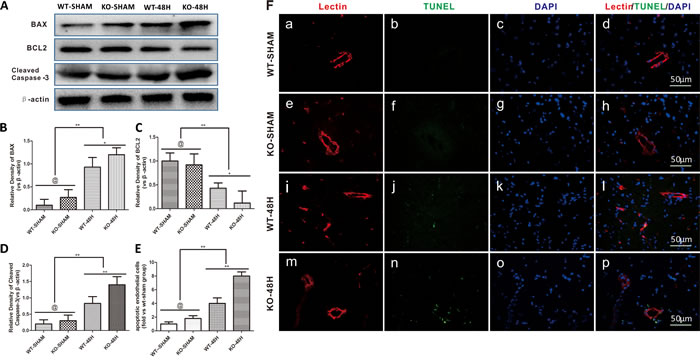Endothelial cells, another main component of the BBB, was also further injured in Apoe-deficient mice at 48 h after SAH. Apoptosis-related proteins including BAX and Cleaved Caspase-3 were significantly upregulated, while the anti-apoptotic protein BCL2 was decreased after SAH. This phenomenon was more pronounced in Apoe-deficient mice, which resulted in increased apoptosis of endothelial cells as shown in Figure 7 (@ represents p > 0.05, **p < 0.01,*p < 0.05, n = 5).