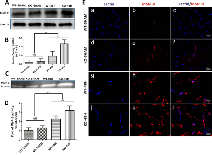 MMP-9 is well studied for the role that it plays in the degradation of BBB TJs and endothelial cells apoptosis [15, 16]. Prior to SAH, both the expression and activity of MMP-9 was not obviously different between the two sham groups (WT-SHAM vs KO-SHAM, @ represents p > 0.05, n = 5). However, after SAH, both the expression and activity of MMP-9 was upregulated, with more severe changes in Apoe-/- mice (WT-48H vs KO-48H, **p < 0.01,*p < 0.05, n = 5) (Figure 8A-8D). Moreover, the perivascular MMP-9 elevation was also significantly higher in the Apoe-deficient mice (Figure 8E).