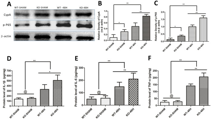 Figure 9: Apoe deficiency aggravates the inflammatory response. Data are expressed as mean ± SEM. Although the main mediators of MMP-9 like CypA and phosphorylated nuclear factor kappa B subunit p65 (p-P65) were slighty different in the sham group, the discrepancy has greater statistical significance at 48h after SAH (*P < 0.05, **P < 0.01 respectively, n = 5) A.-C.. The enzyme-linked immuno sorbent assay (ELISA) measurement of TNF-α, IL-6 and IL-1β, another three inflammatory mediators of MMP-9 downstream the CypA- NF-κB related pathway, showed no significant difference of these inflammatory cytokines. Nevertheless, the discrepancies of these cytokines have greater levels at 48h after SAH in Apoe-deficient mice compared with WT mice (@ represents that p > 0.05, **P < 0.01 respectively, n = 5) D.-F..