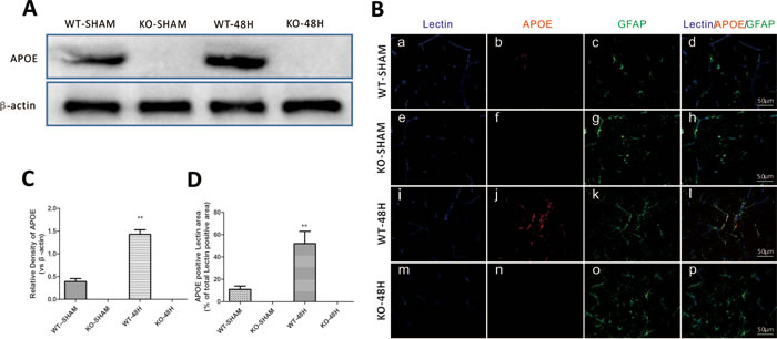 Compared to sham treated mice, the expression of APOE began to elevate at 6h after SAH induction. By 24h, APOE was significantly increased and peaked at 48h. (Figure 3A, 3C). The immunofluorescent staining of APOE also continuously increased and peaked at 48h. In addition, a significantly increased colocalization of glial fibrillary acidic protein (GFAP) positive APOE immunoreactive cells with lectin positive microvessels provided important information that APOE function may be associated with the BBB integrity after SAH. (Figure 3B, 3D). (**p < 0.01,*p < 0.05 respectively, n = 5).