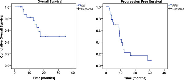 The median OS estimated on the whole patient cohort was 18 months (76% at one year, 49% at two years), with a median follow-up time of 12 months (range 2–35). The median PFS was 9 months (28% at one year, 17% at two years).