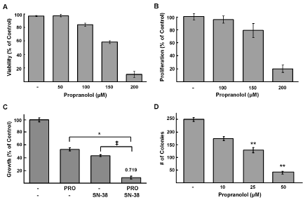 IC50 values were determined with alamarBlue assay (Invitrogen, Burlington, ON, Canada). 3-6 x103 cells were plated in 96-well plates and treated with indicated doses of propranolol for 72 hours. At 48 hours, alamarBlue was added (10% of total volume) and then incubated overnight. The fluorescence was measured using a spectrophotometer at excitation 530 nm and emission 590 nm (Spectra MAX Gemini EM, Molecular Devices). Cell proliferation was assessed using Bromodeoxyuridine (BrdU) (Cell Signaling, Danvers, MA, USA). 4000 cells were treated with indicated drug and then incubated with BrdU (10μM) for 4h and detected using anti-BrdU antibody. The absorbance was measured at 450nM using a spectrophotometer plate reader (VersaMax tunable microplate reader, Molecular Devices). Trypan blue exclusion assay (Gibco, St. Louis, MO, USA) was used to measure viability following 24 hours of propranolol treatment. Live and dead cells (trypan blue positive) were counted in triplicate using a hemocytometer. For the colony or foci formation assay cells were seeded (102/well in six-well plates) in 2 ml of growth medium and incubated overnight at 37°C. Propranolol or media was added at the specified concentrations. Every 24h fresh propranolol and growth medium was added, and the plates were incubated at 37°C. Fourteen days after seeding, colonies were fixed in 70% ethanol and stained with 10% methylene blue. Colonies of 50 cells were counted.
