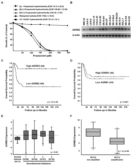 Figure 3: Growth inhibition is specific to β2-blockers and β2-AR is expressed in NB. A, SK-N-SH was treated with increasing doses of either (±)-propranolol HCl enantiomers and a β1-AR specific antagonist, metoprolol tartrate, or a β2-AR specific antagonist, ICI 118,551 HCl for 72 hours. Results are expressed as percentages of growth compared with untreated controls. Data shown are representative of three independent experiments and are expressed as means of triplicates ± s.d. For each β-AR antagonist, the IC50 of each cell line is shown with the corresponding legend. B, β2-AR (ADRB2) expression in NB cell lines as demonstrated by semi-quantitative PCR. C-D, Cumulative overall survival probability curves of patients with neuroblastoma based on expression of ADRB2 mRNA [C] or ADRB1 mRNA [D] (N=88 patients, Versteeg dataset). The cut-off for these analyses is the median expression level, high and low represent levels of expression for 44 patients in each group relative to the mean. E, Relative ADRB2 mRNA expression in normal adrenal tissue and neuroblastoma samples. F, Relative ADRB2 mRNA expression in MYCN non-amplified and amplified neuroblastoma samples. Kaplan-Meier curves and Box blots were generated from the R2: microarray analysis and visualization platform (http://r2.amc.nl), which includes data submitted by different investigators (Databases: 1, Versteeg; 2, Delattre; 3, Hiyama; 4, Lastowska).