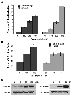 Figure 4: Propranolol induces apoptosis. A, SK-N-SH and SK-N-BE(2)c were treated with indicated doses of propranolol for 5h and cellular caspase 3/7 activities were analyzed. Results are representative of three independent experiments, performed in triplicate and are expressed as mean fold-induction over the control cells ± s.d. B, LAN5 and SK-N-BE(2)c cells were treated with indicated doses (24 hours) and live cells were analyzed for induction of annexinV positivity by flow cytometry. Results are expressed as mean fold-induction over the untreated control ± s.d. C, SK-N-BE(2)c cells were treated with indicated doses for 48h and CHLA-20 cells were treated with 150 μM of propranolol for indicated durations and then analyzed for PARP cleavage by immunoblot analysis.