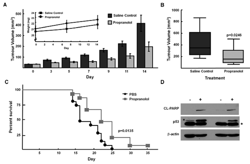 Figure 6: Propranolol inhibits neuroblastoma tumor growth in vivo. NOD/SCID mice with SK-N-AS xenografts were treated with propranolol (1mg/kg bid) by subcutaneous injection for 14 days. A, Tumour volumes measured at indicated days post-injection of cells. Inset, absolute mean body weight, in grams, after the beginning of the treatment. Columns depict mean values; bars, SE. B, Box plot depicting mean tumour volumes of control (vehicle) treated and propranolol treated tumours at day 14. Each treatment group was composed of 10 mice (p<0.05). Bars depict mean values and error bars represent 95% confidence intervals. p values (2-tailed) were calculated using students t-test and are compared to control groups at indicated time points. C, Kaplan–Meier survival curve of NOD/SCID mice from control-treated (black, circle; N=15) or propranolol-treated (grey, square; N=15) tumours. Wilcoxon: p= 0.0135, Log-Rank: p=0.0062. D, p53 and cleaved-PARP western immunoblots of lysates from SK-N-AS xenografts harvested day 14 (lanes 1,2) and day 22 (lanes 3,4) post vehicle control or propranolol (1mg/kg/dose bid). Note: asterisk refers to a faster migrating non-specific band detected in p53 immunoblot of SK-N-AS xenograft lysates.
