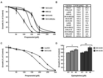 Figure 1: Propranolol inhibits neuroblastoma growth. A, Growth curves of NB cell lines treated with indicated doses of propranolol for 72h. B, IC50 values for fifteen NB cell lines. IC50 measurement was performed with alamarBlue (triplicate). Results represent the average of three experiments expressed as a mean percentage of untreated control cells. C, HUVEC cells were treated with indicated concentrations of propranolol and IC50 was determined with alamar blue (triplicate). Results represent the average of three experiments expressed as a mean percentage of untreated control cells. D, SK-N-SH and SK-N-AS cells were stimulated with indicated doses of EPI for 24h. Cell growth was measured using alamarBlue (triplicate) and normalized to untreated controls. Data shown are representative of three independent experiments and are expressed as means of triplicates ± s.e. *p=0.04, **p=0.011