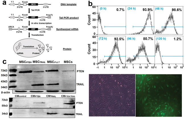 Figure 2: mRNA synthesis and in vitro expression in MSCs. a. Flow chart of mRNA synthesis in vitro; b. Assessment of transfection efficiency in GFP-mRNA-transfected MSCs. Top panel shows the FACS results of time-dependent changes of GFP-positive MSCs after GFP-mRNA transfection; Lower panel displays a representative microscopic field under regular light (left) and green fluorescent light (right) respectively. The images were taken from MSC culture 2 days after transfection. The original magnification, 400X; c. Immunoblotting analysis of TRAIL and PTEN in cell lysates (top panel) and conditioned media (bottom panel).