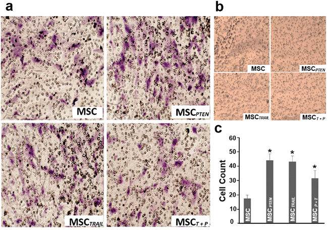 Figure 3: In vitro migratory ability of MSCs. a. The migratory ability of native MSCs, MSCTRAIL, MSCPTEN and MSCTRAIL/PTEN (MSCT+P) toward DBTRG glioma cells using a transwell co-culture system. Representative photomicrographs of stained membrane show migrated cells. Magnification, 100x. b. MSCs’ migration test using native MSCs as control cells at the bottom of the chamber. c. Summary of three independent experiments was presented as mean ± SEM. The cell number of each filter membrane was obtained from the average of five randomly selected microscopic fields. * p < 0.05 vs. native MSC.