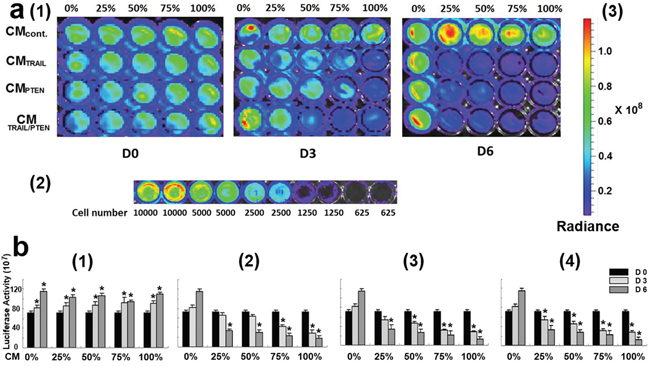 Figure 4: a. Assessment of DBTRG cell viability using bioluminescence determination. (a1) Representative measurement of luminescence intensity. Cell culture medium was indicated on the left side of the graph. CM ratios and time points were labeled at the top and bottom respectively. The luminescence intensity of each well was determined by IVIS Spectrum System 10 min after adding D-luciferin. (a2) Sensitivity test of IVIS Spectrum System. The bioluminescence signal was not detectable when the cell number was less than 625 cells/well. (a3) Luminescence scale. Color scale: Min = 6.31 x 106; Max = 1.19 x 108. Radiance intensity was expressed as p/sec/cm2/sr. b. Summary of DBTRG cell viability. DBTRG cells were co-cultured with CMcontrol (b1), CMTRAIL (b2), CMPTEN (b3) and CMTRAIL/PTEN (b4). The relative cell viability was represented as luciferase activity. Data were presented as mean ± SEM. * p < 0.05, compared with control (day 0) at the same CM ratio in b1 and compared with control (0%) at the same time point in b2-b4.