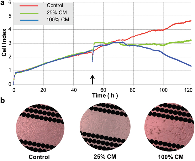 Figure 5: Real-time assessment of conditioned medium (CM)-induced cytotoxicity in DBTRG cells. a. Real-time monitoring of CM-induced cytotoxicity in DBTRG cells. Cell index was automatically recorded with the xCELLigence real-time cell analyzer (RTCA) every 5 min until the end of the experiment (120 h). Each tracing represents an average of three parallel assessments. The arrow indicates the time when the culture medium was replaced with CMPTEN with different ratios. b. Microscopic observation of BBTRG cells in the E-Plate. Images were taken from the E-Plate 16 of the xCELLigence at the end of the experiment and representative image was shown from each setting. Original magnification, 400x.