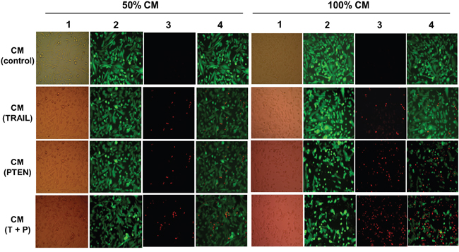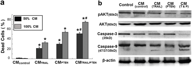 CM-induced DBTRG cell death was also examined at day 4 with fluorescence microscopy after LIVE/DAED staining. Two CM ratios, 50% and 100%, were used in this part of the study. As shown in Figure 6 and Figure 7a, marked cell death was observed on DBTRG cells incubated with CMTRAIL and CMPTEN. It is worthwhile noting that the CMTRAIL/PTEN-induced cell death was further increased compared to the treatment with CMTRAIL or CMPTEN (p < 0.05) under two tested CM ratios. Figure 7b showed the results of immunoblotting analysis of apoptosis-related proteins in DBTRG cells during indirect co-culture. DBTRG cells expressed similar amount of total AKT after the treatment with various CMs. However, the phosphorylated form of AKT (pAKT, Ser473) was obviously down regulated by the treatment of CMTRAIL and CMPTEN alone or their combination. CMTRAIL, CMPTEN and CMTRAIL/PTEN-induced procaspase-9 cleavage and caspase-3 activation were also consistent with apoptosis.