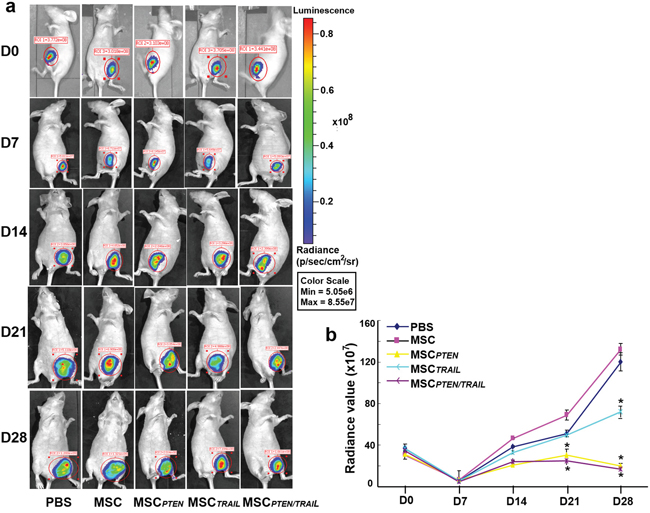 Figure 8: The antitumor effects of TRAIL- and PTEN-mRNA-engineered MSCs in xenografted animal model. Nude mice received xenotransplantation of DBTRG-Luc cells (1x107 cells/each) on day 0 and received initial intravenous injection of various MSCs (0.5x106 cells) on day 7, including native MSCs, MSCTRAIL, MSCPTEN and MSCTRAIL/PTEN (3 mice each group). The mice in control group received injection of the same volume of PBS. The additional cell application was given on days 14 and 21. The whole animal images were taken every week starting from day 0 until the end of the experiment (day 28). Radiance value was used to represent the amount of bioluminescence-producing cells or tumor volume. The representative images were shown in Figure 8a and the time-course of xenografted tumor growth was presented in Figure 8b. Results shown were mean ± SEM (n = 3). *p < 0.05, compared with control.
