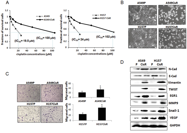 We developed two cisplatin-resistant NSCLC cell lines, A549CisR and H157CisR, by treating A549P and H157P cells with an increasing dose of cisplatin over 6 months [26]. These cells showed about 5 times higher IC50 values than parental cells (Figure 1A).